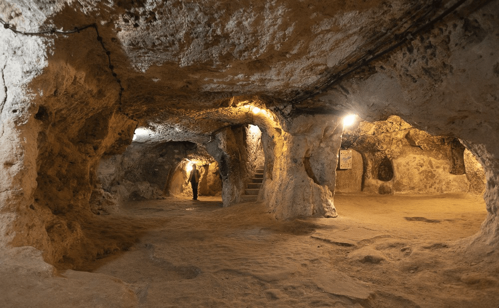 L’art de creuser la roche s’exprime pleinement à Derinkuyu. Une cité souterraine a été aménagée pouvant accueillir 10 000 personnes sur 8 étages et 50 m de profondeur. Les populations agressées s’y repliaient pour échapper aux invasions. Toutes les fonctions sont présentes ; les étables en haut, les chambres et les fonctions vitales (stockage de vivres, cuisines avec cheminées, puits) juste en dessous, puis l’école et tout en bas l’église et le baptistère … fondamental pour éloigner le danger ! Les circulations se font par des boyaux de moins de 1,5m de haut et 60 cm de large sur plusieurs dizaines de mètres avec plus d’une centaine de marches… ça se mérite ! Ces villes servirent depuis l’époque Romaine jusqu’au début de XX s, pour échapper aux épurations ethniques (source Wikipédia)