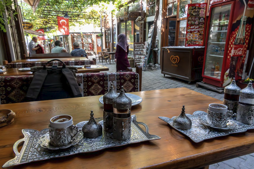 Le passage de la frontière à Ipsala est une formalité. Arrêt au distributeur bancaire qui nous délivre une belle liasse de billets puis achat d’une carte SIM et de data, un peu chers… beaucoup plus économiques en ville ! En fait, il s’avère inutile de prendre beaucoup d’espèces dans la mesure où la carte bancaire est admise dans la quasi totalité des commerces, même pour payer deux cafés… turcs comme il se doit !