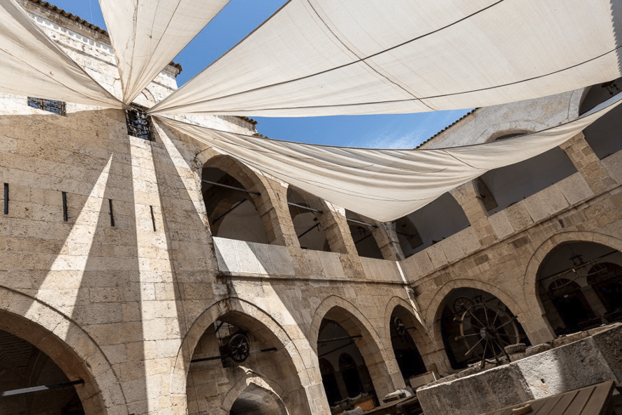 Au centre de Pergame, le quartier ancien commerçant et ses petites places ombragées sont propices à l’achat des spécialités comme les baklavas, pâtisseries au miel. En janvier nous apprécions que les arbres laissent plutôt passer le soleil.