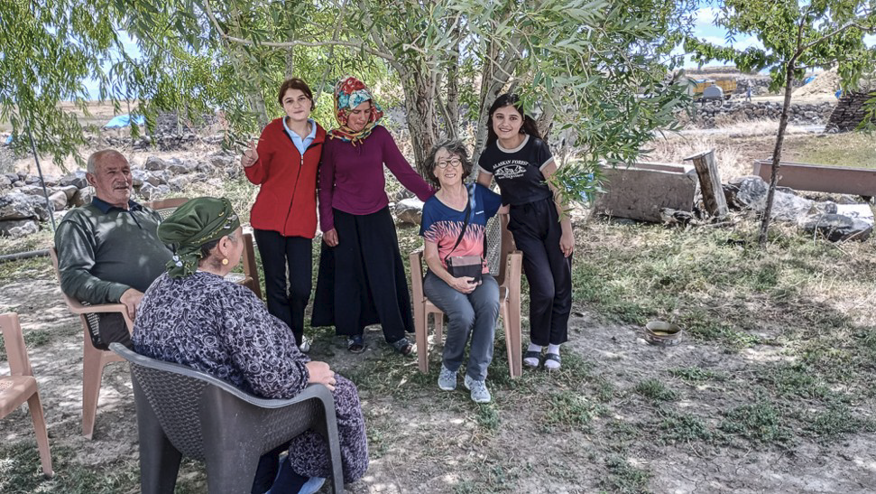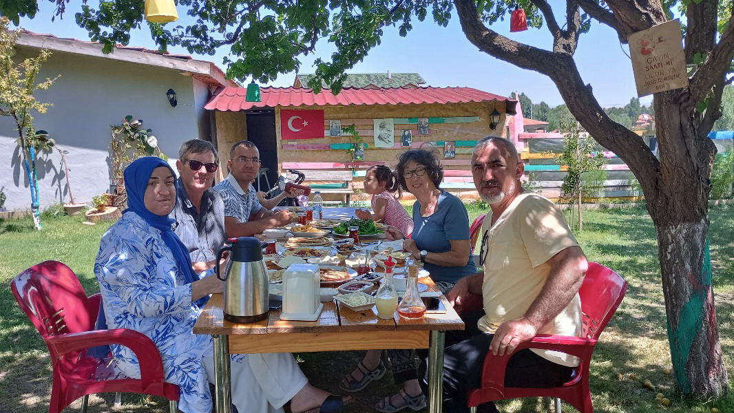 En empruntant une petite route vers Digor, qui devient vite une piste, un trou au milieu de la voie, dans un village, nous oblige à faire demi-tour. Nous sommes l’attraction. Les habitants viennent nous renseigner puis très vite nous invite à boire le thé. Toute la famille et progressivement les voisins de ce village qui ne compte qu’une vingtaine de personnes, se rassemblent. Grace à google-traduct nous échangeons quelques infos sur nos modes de vie respectifs. Ici, seuls les hommes et les invités sont assis à la table, mais les femmes restent présentes et participent.