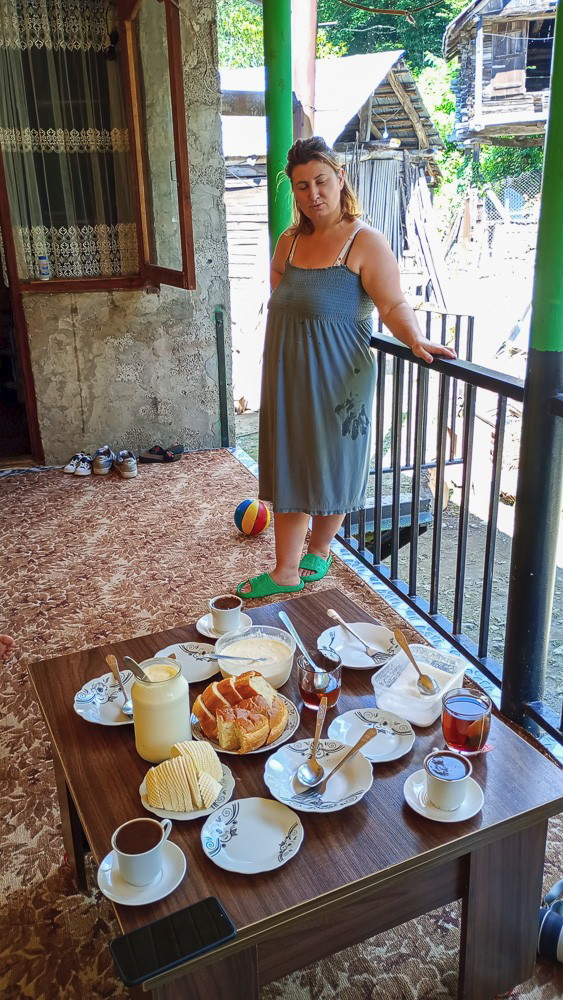 Dans un des villages, en descendant du Mobilcub, un papy nous invite à boire un café. Il nous emmène chez lui, nous fait visiter son vivier à truites, ses ruches, son poulailler. Sa dame nous sert une copieuse collation avec 3 sortes de très bons fromages, du caillés du liquide au solide, du café, du thé, du miel maison… l’alphabet géorgien limite Google traduc (bonjour = Დილამშვიდობისა ), c’est donc le petits fils qui parle en peu anglais qui fait l’interprète. Un bon moment de convivialité.