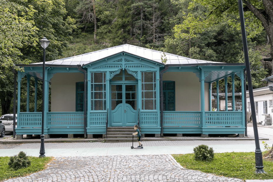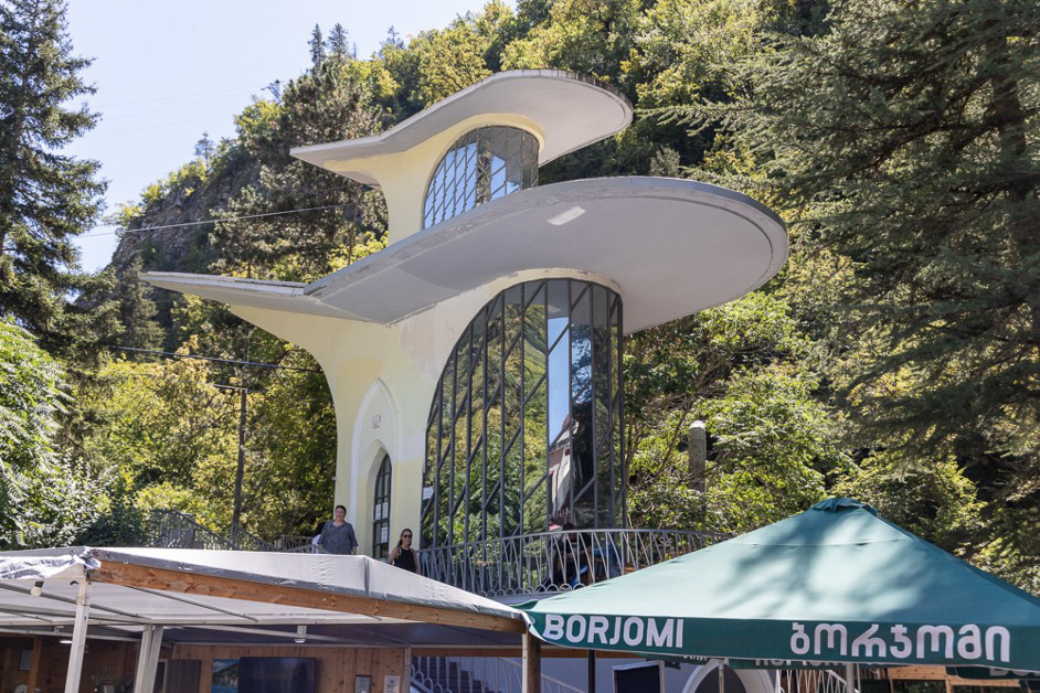 Borjomi est une ville de montagne où les Turques nantis viennent en villégiature prendre le frais dans un grand parc au bord d’un torrent bordé de quelques anciennes belles maisons en bois . Une des attractions est le téléphérique tout droit sortie des années soixante, qui nous mène en altitude pour une balade dans la forêt.