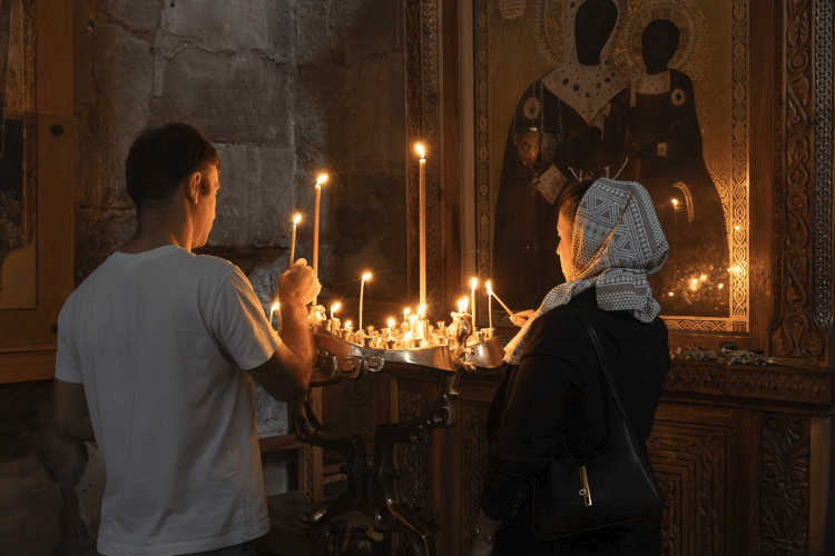 Mtskheta est un haut lieux religieux orthodoxe. Les gens viennent de loin pour suivre les offices et embrasser les murs de l ‘église et les icônes, au sens propre… ou plutôt sale…, car les vitres de protection sont bien grasses.