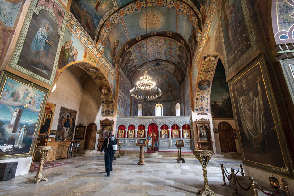 Les Popes aux longues barbes et aux ventres bien rebondis, surveillent le respect du code vestimentaire ; pour les femmes, tête et jambes couvertes mais il semble qu’ils tolèrent les décolletés plongeant et jupes fendues notamment de la mariée et de ses témoins.