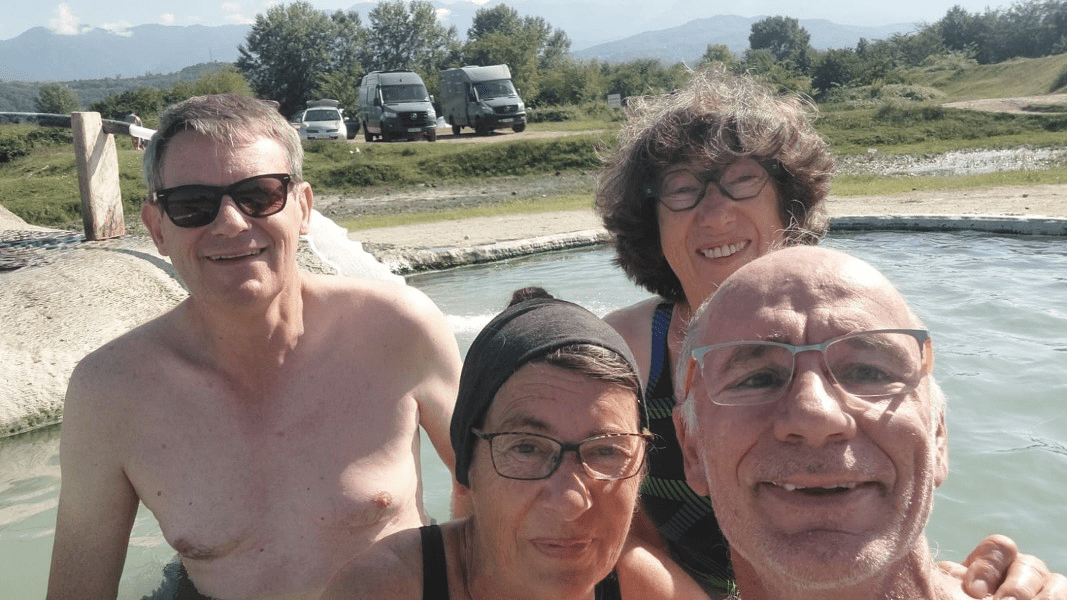 Nous retrouvons Pascale et Gérard qui sont aussi en Géorgie, le temps d’une soirée et d’un bain dans un hot-pot d’eau sulfureuse à 40° sous un soleil ardant. Le dernier que nous ayons pris ensemble était en Islande, la température de l’eau, semblable, sentant aussi le souffre, mais l’air était à 5° ! 42,10442 N, 42,58707 E