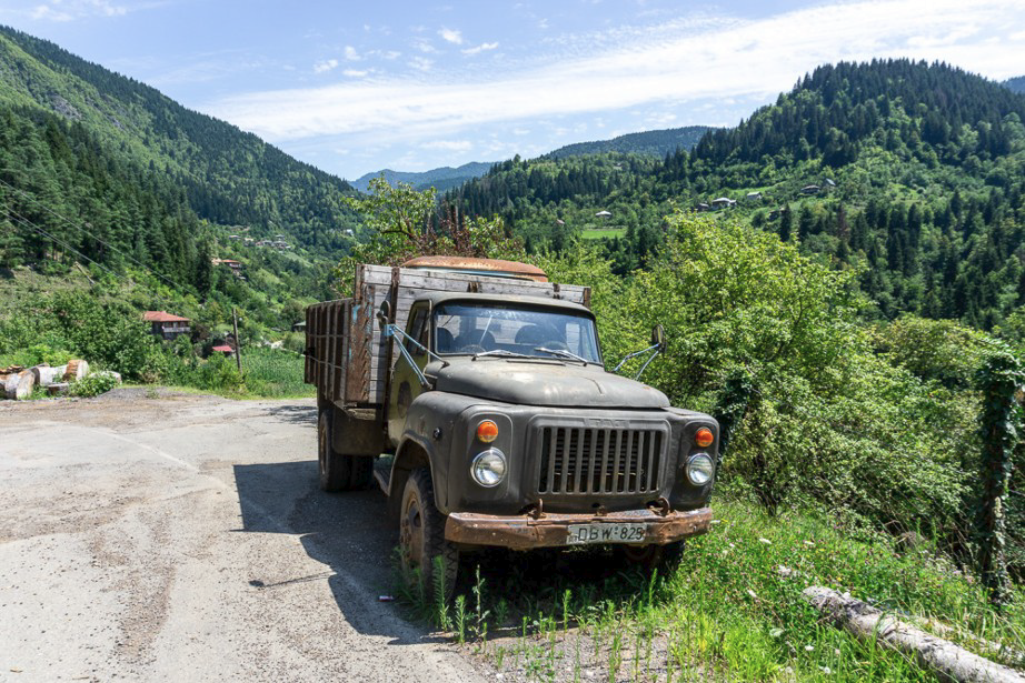 La route du col de Goderdzi est très fréquentée. Nous l’empruntons un dimanche après midi lorsque les Géorgiens rentrent vers Batumi. Rien d’exceptionnel… en principe. Mais sur une bonne vingtaine de kilomètres, la « route » est encore à l’état de piste bien défoncée car les travaux s’éternisent. Alors là, c’est le spectacle ! Entre les berlines qui roulent au pas, les berlines qui foncent tant bien que mal et les SUV cossus qui font bien sentir à la populace qu’il faut leur céder la place, c’est le plus gonflé qui passe. Parfois il n’y a qu’une voie, tout le monde force jusqu’au blocage dans la poussière, à coups de klaxon… jusqu’à ce qu’il y en est un qui accepte de reculer… Mais pour un Géorgien laisser passer ! Jamais de la vie mon statut de mâle ne l’accepte pas.