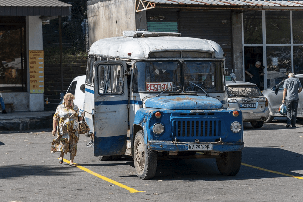 A coté des grosses berlines allemandes rutilantes, de nombreux véhicules témoignent d’une conduite à risque ! maints pares-chocs sont démontés préventivement car la circulation locale les expose à de fréquents remplacements. Les voitures sont cabossées de tous les cotés, et il n’est pas rare de les voir complètement hors d’usage sur les dépanneuses. Pour le conducteur Géorgien, chaque centimètre gagné sur le voisin est une victoire et témoigne de l’individualisme qui règne sur la route au mépris du risque. Dépassement sans visibilité, vitesse excessive, vroom, vroom assourdissant en ville, la « bagnole » est reine.