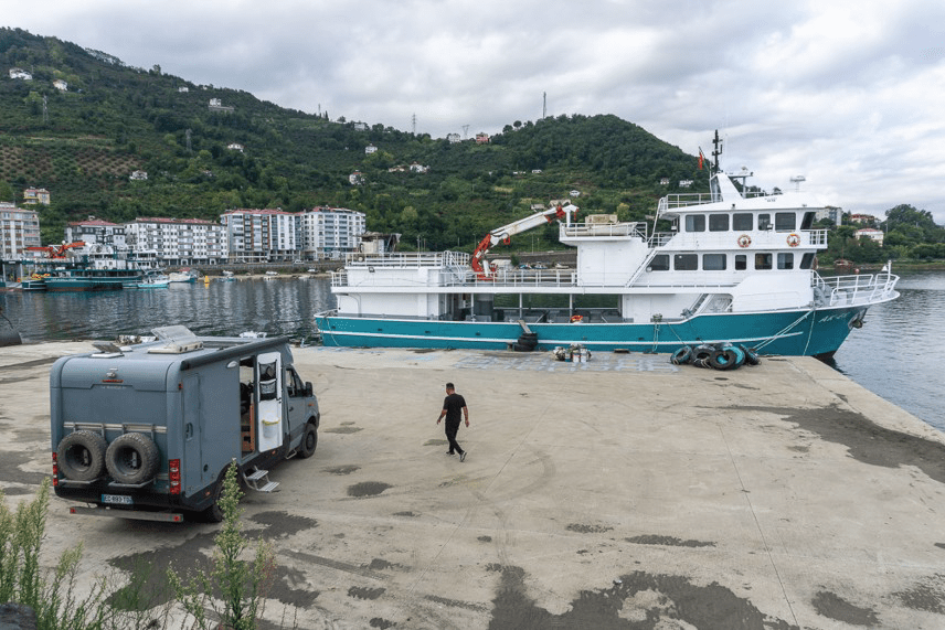 Le bivouac est difficile sur la côte. P4N indique un port où il est possible de stationner la nuit. Nous y passons le portail grand ouvert et circulons dans l’enceinte à la recherche d’un coin tranquille. Le patron du port vient à notre rencontre en nous demandant de le suivre car certains endroits sont fréquentés par des « Some men are drinking » textuellement. Il nous conduit au bout du quai à coté de la cabane des gardiens pour nous mettre en sécurité. Quelle attention ! Un des employés nous invite à prendre le thé et nous bavardons dans un anglais sommaire pendant une heure. Le lendemain matin, d’autres nous convient à nouveau à boire le thé, mais ne parlant pas anglais les échanges sont très limités mais illustre la culture de l’accueil des Turcs. Port de Çarsibasi 41,08186 N, 39,37076 E