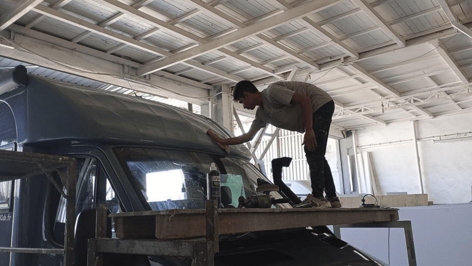 Par le réseau, merci Lyonnel, nous avons connaissance d’un carrossier à même de donner un coup de Polish sur le mobilcub. En effet, sa peinture commence à pâlir après ces années passées au soleil et de nombreuses branches pas très sympathiques qui se sont chargées de dessiner des lignes parallèles sur la carrosserie et les fenêtres.